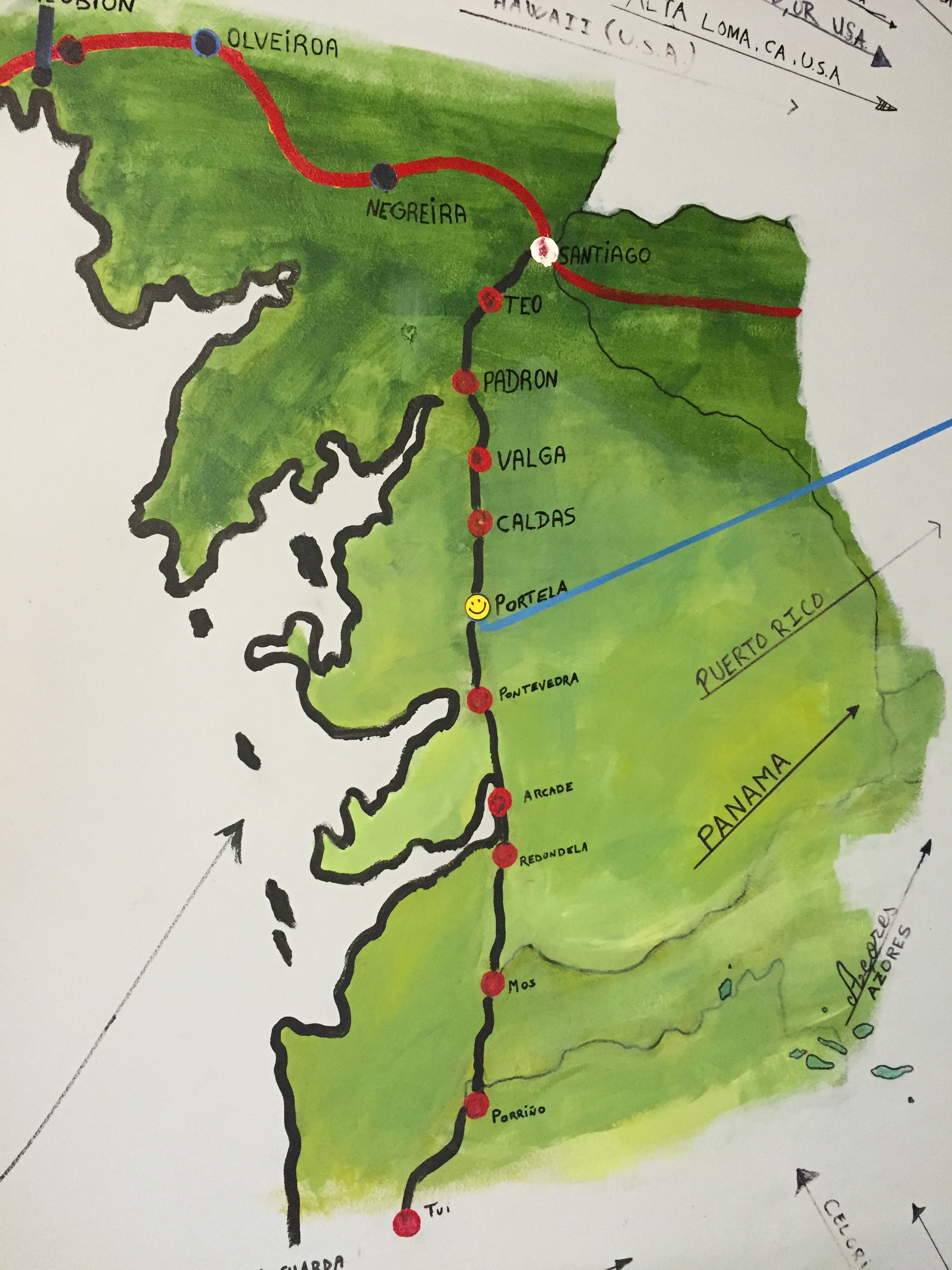 After our wild night out with peregrinas at the Parador, Karin and I were both slow to get moving. The lobby of the albergue has an awesome map of the Camino Portugués on the wall, so we took a few photos.